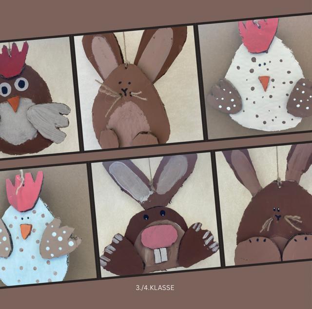 Nachdem die Farbe getrocknet war, wurden die einzelnen Teile mit der Heißklebepistole zusammengeklebt. So sind die ersten Hasen und Hennen entstanden, die jetzt unsere Schule für Ostern schmücken.