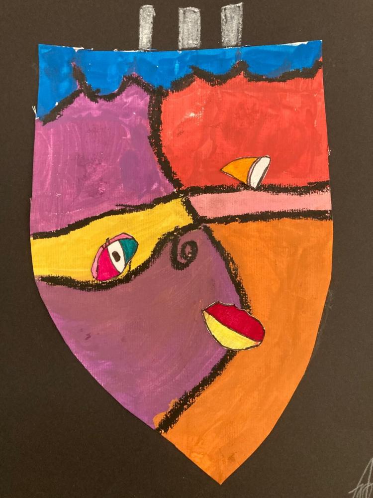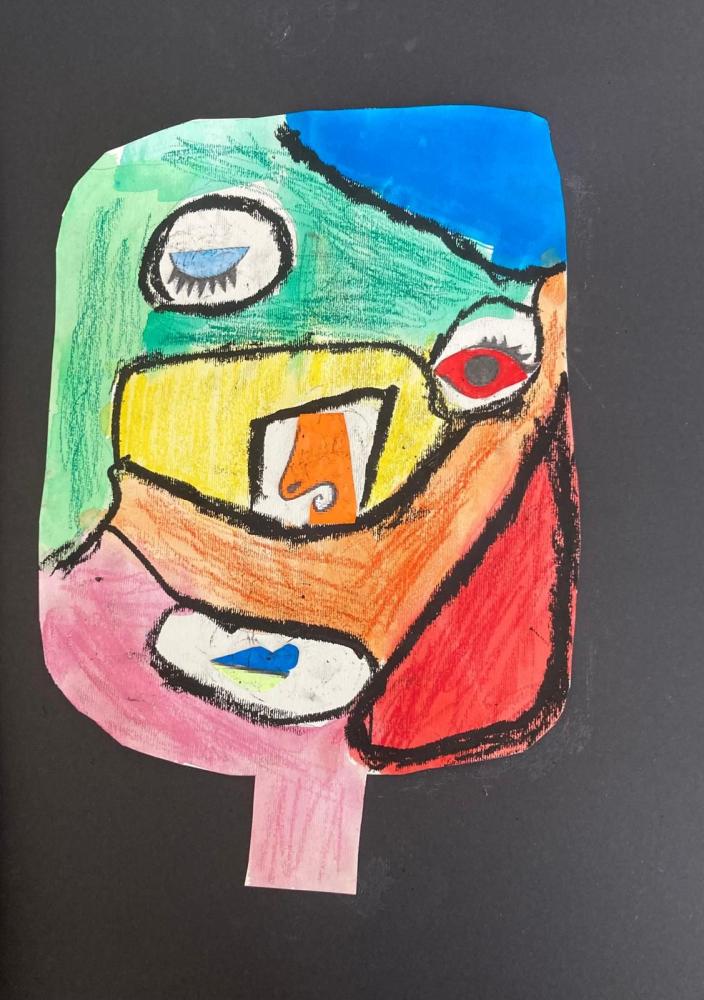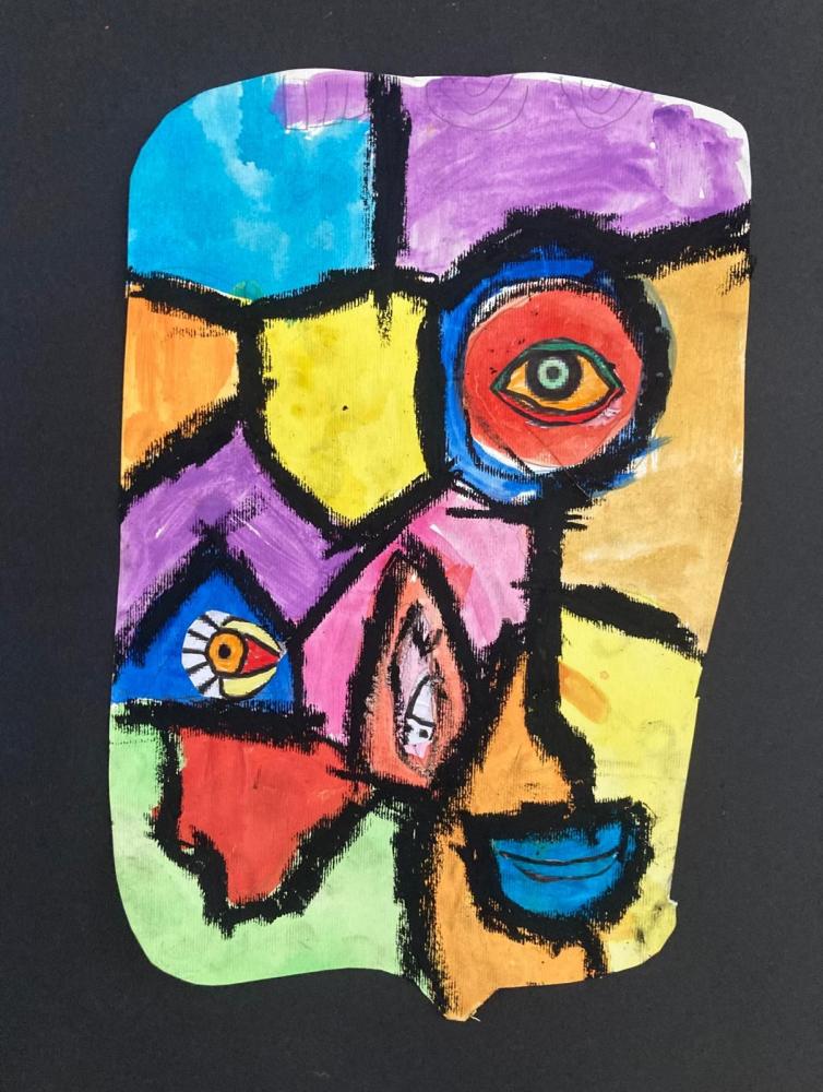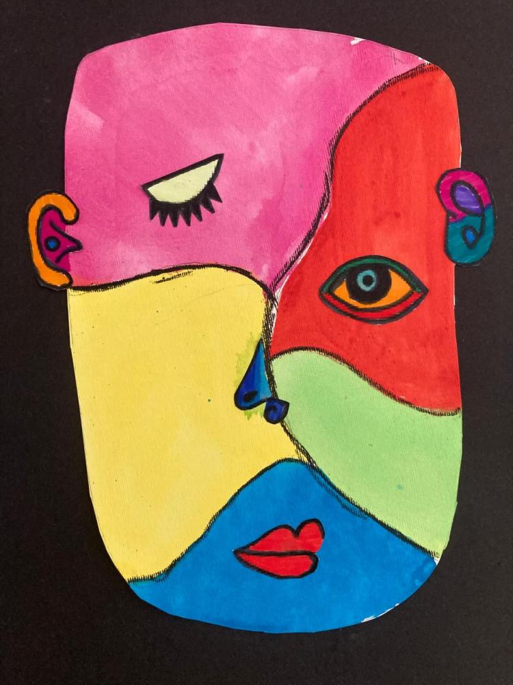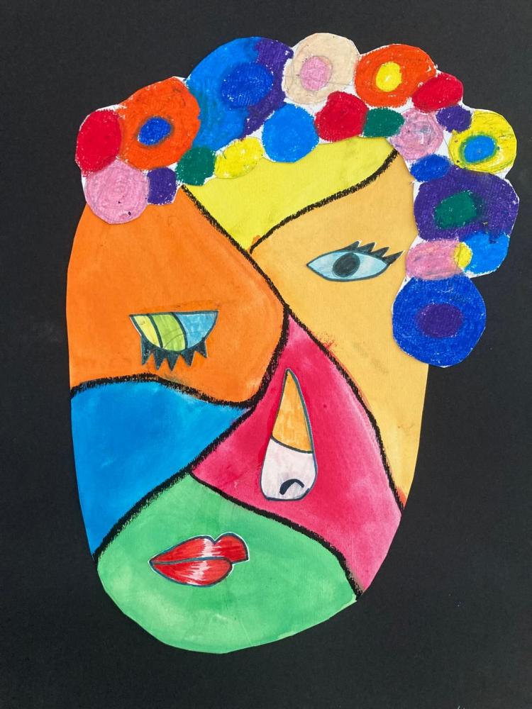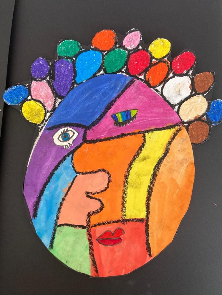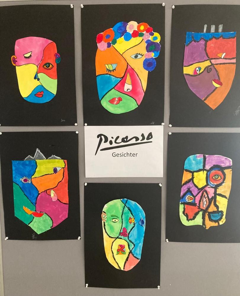 PICASSO Gesichter von Patricia Garufi-Lang 14. Oktober 2025 "Ich würfle mir einen Picasso!" Die Würfelaugen gaben vor, wie die Gesichtsteile zu gestalten waren.(Deckfarben und Ölkreiden)