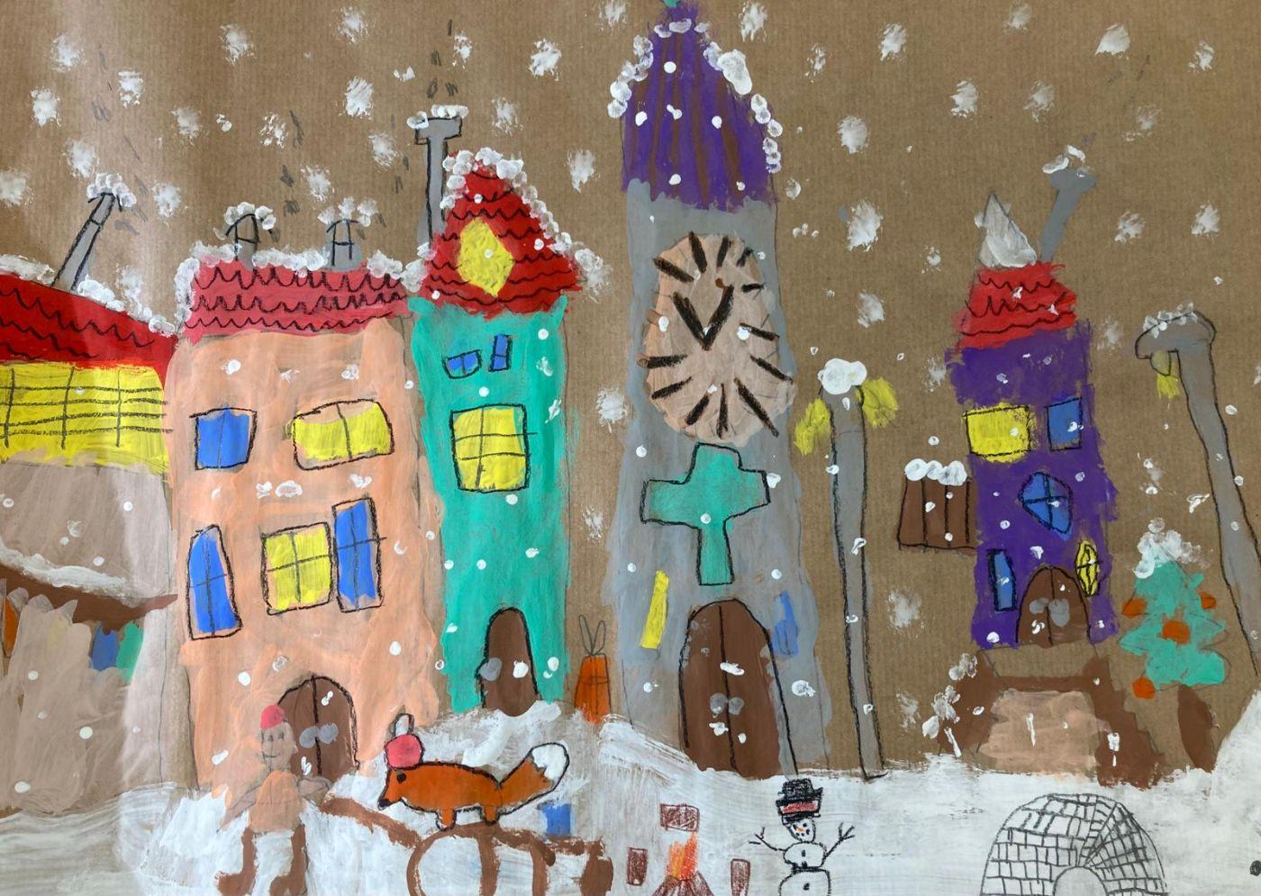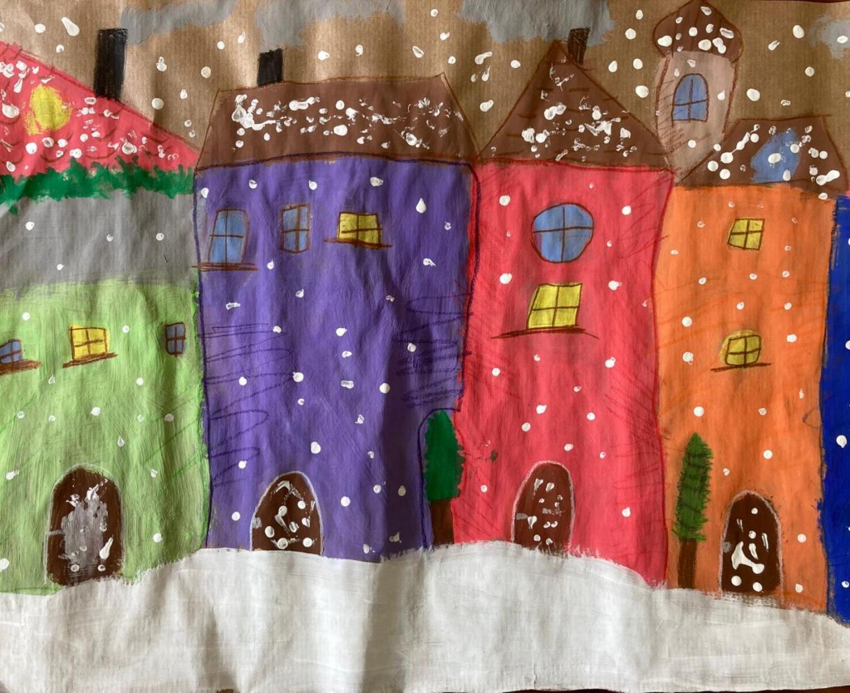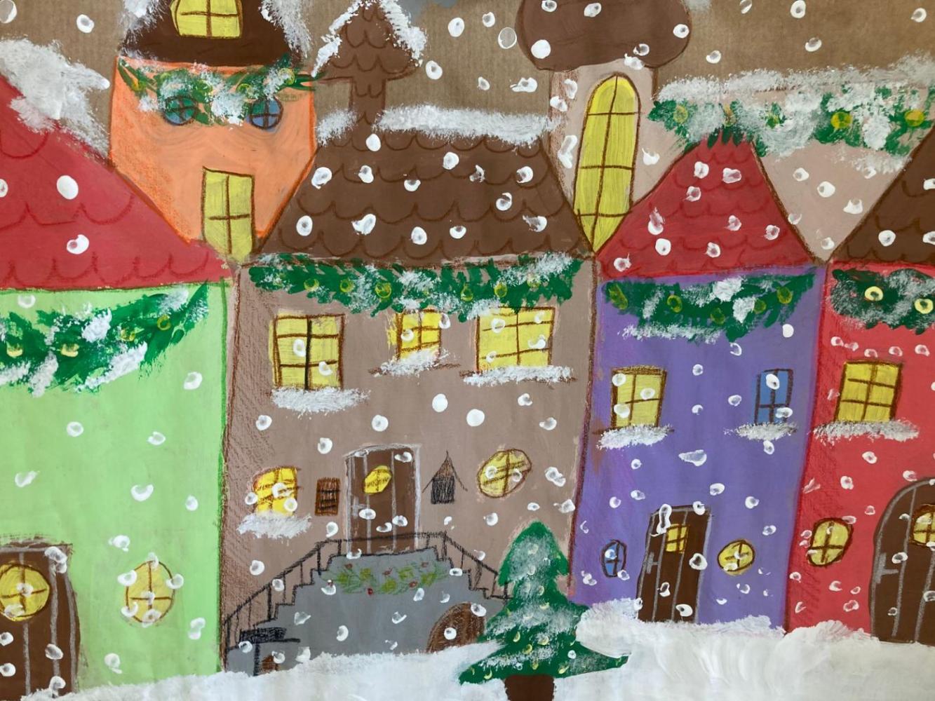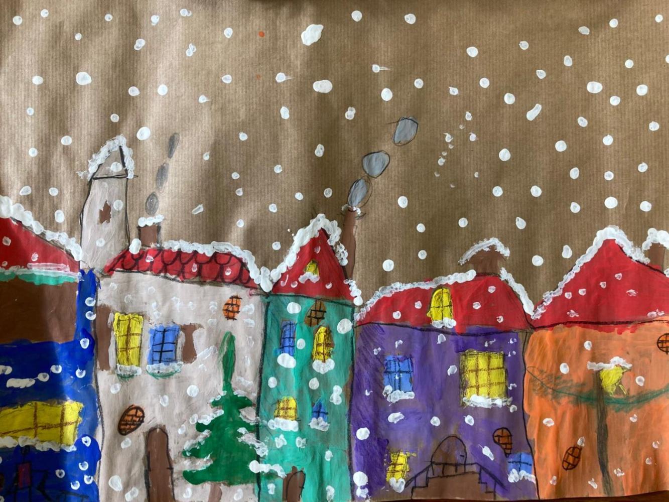 Zuerst zeichneten wir eine Skizze vom Winterdorf mit Häusern, Dächern und Fenstern. Dann mischten wir die Acrylfarben und malten alles aus. Mit Buntstiften fügten wir kleine Details hinzu. Zum Schluss tupften wir weiße Punkte auf – wie Schnee auf den Häusern.