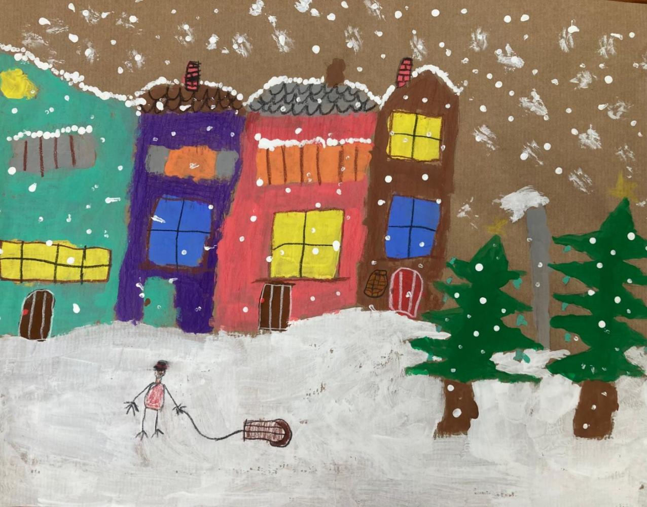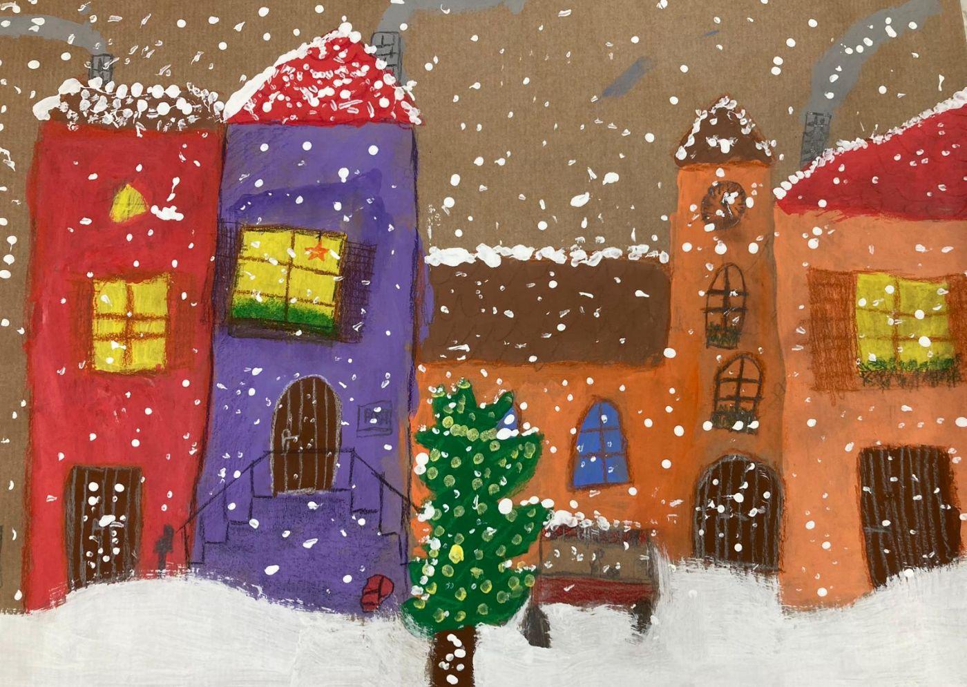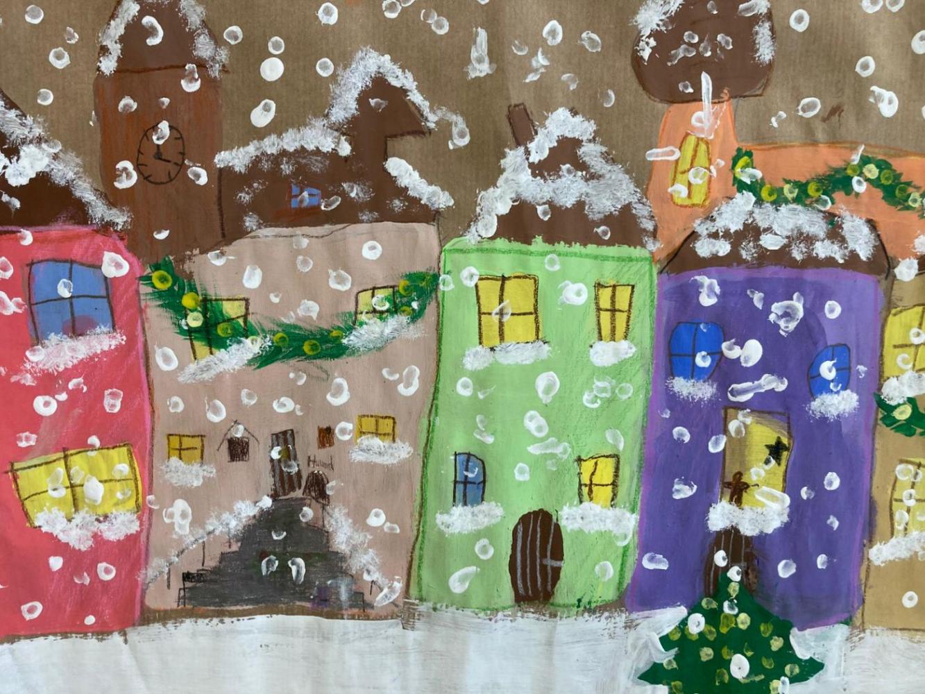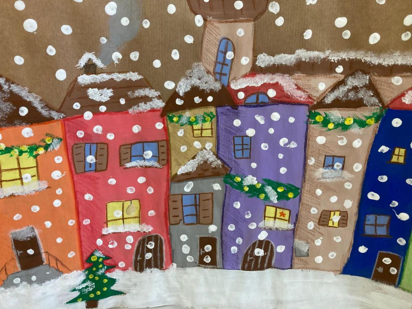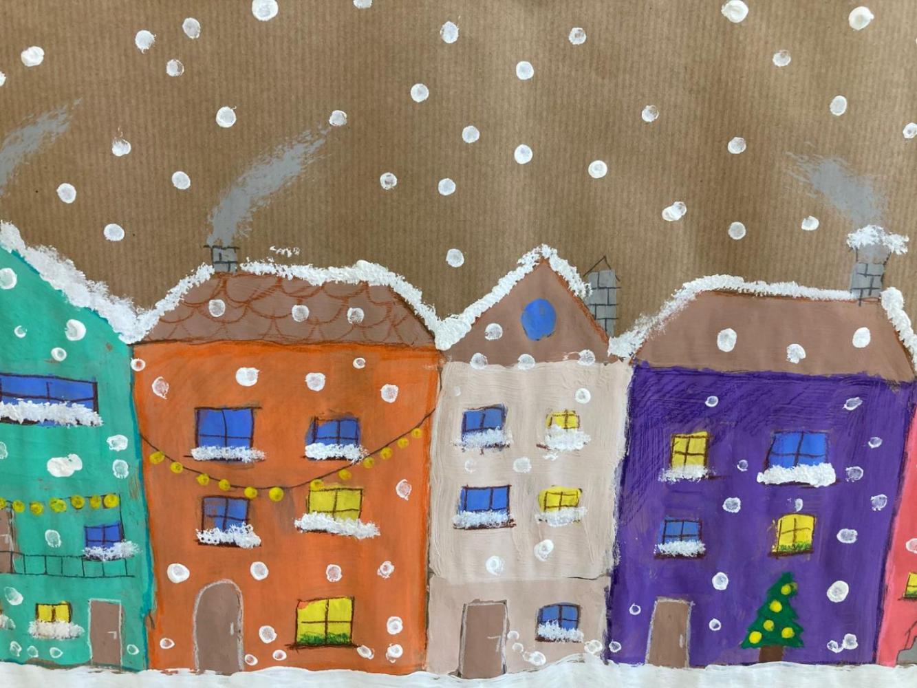 Zuerst zeichneten wir eine Skizze vom Winterdorf mit Häusern, Dächern und Fenstern. Dann mischten wir die Acrylfarben und malten alles aus. Mit Buntstiften fügten wir kleine Details hinzu. Zum Schluss tupften wir weiße Punkte auf – wie Schnee auf den Häusern.